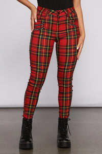 Keep it stylish in plaid pants that are all the rage this season. The pants feature a plaid print, high rise waist, faux zippered pockets, and a skinny leg fit. The pants are composed of a lightweight woven fabric that offers a slight stretch. Complete your look with a basic black bodysuit.