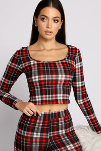 Keep it classic in a plaid pajama crop top this is perfect for those chilly nights. The leggings feature a scoop neckline, long sleeves, a plaid print, and a cropped hem. Complete your cozy night in look with the matching pajama and fuzzy slides.
