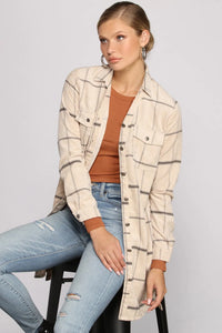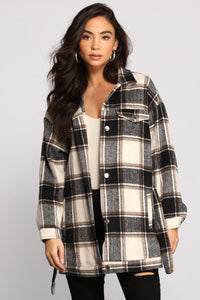 This shacket is the one you need to get those cozy vibes going! The shacket features a collared neckline, two chest pockets, a multi-button down front, a tie waist belt with belt loops, and a plaid print. Complete your look with black skinny jeans.