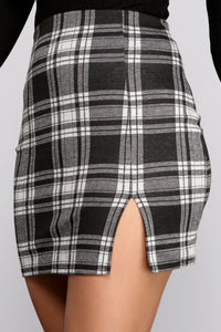Keep your stylish look in check with this adorable plaid mini skirt! It features a high rise waist with a trendy side slit and a short, form-fitting style. Pair this skirt with a basic bodysuit and heeled booties for a city-chic look.