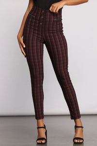Keep your style in check with these trendy plaid skinny pants! They feature a flattering high waist with snap button front closures and a tapered leg fit. Pair these pants with a curve-hugging bodysuit and strappy heels for a casual date night look.