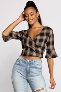 Keep it pretty and chic in a plaid crop top! The top features a plunging wrap V-neckline, quarter-length flutter sleeves, a chic plaid print, and a lower back keyhole with back ties. Complete look with high waist jeans.