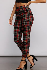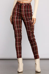 Keep it poised in plaid pants to create a preppy look! The pants feature a high rise waist, a plaid print, cargo-styled pockets, and a skinny leg fit. Complete your look with a cute crop top and ankle booties.