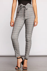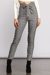 Get a fashionably chic vibe, perf for the office, in these plaid skinny pants! They feature a flattering high rise waist with a front V cut and a tie front detail. Pair these pants with a form-hugging bodysuit for an adorable look.