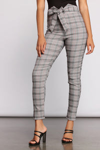 Keep it posied in plaid pants that bring the chic factor to your outfits! The pants feature a high waist, a tie waist belt, a trendy plaid print, and a skinny leg fit with a tapered hem. Complete your look with a black top and mules.