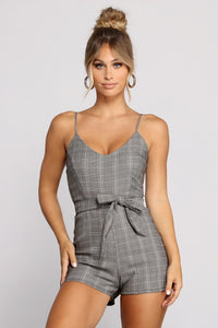 Keep it playful in a chic plaid romper for your next date night. The romper features a sleeveless V-neckline with spaghetti straps, a chic tie-waist belt, and fitted cheeky shorts. Complete your look with chunky sneakers.