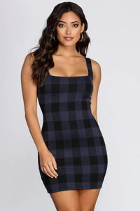Keep it poised with trendy plaid! The mini dress features a sleeveless bodice, a square neckline, tank-like straps and a mini length silhouette that hugs curves all over. The all over plaid season is perfect to stay on trend this season! Dress is composed of a knit fabric.