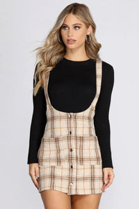 Make your 'fit trendy and chic with this plaid overall skirt! It features long shoulder straps with adjustable buttons, a complete snap button down front, large front pockets, and a short, mid-thigh length hem. The thick woven fabric has no stretch and offers a form-fitting style.