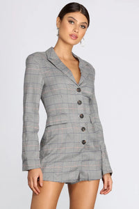 Step out in the city with an outfit that does all the work for you! Designed with a collared neckline that leads to a v, and functioning buttons down the center. Romper is fully lined, has long sleeves and is slightly padded at the shoulders. Featuring two faux pockets below the breast and a fitted bodice that finishes at the hem with shorts. Composed of a knit material that offers slight stretch, and showcases a glen check plaid pattern.Style Number/Barcode: 06403-0069
