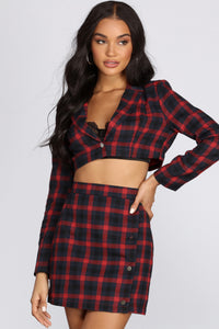 Keep it rad in plaid my babe! We are obsessed with plaid this season, and this blazer has just the touch were looking for! Designed with a collared neckline, long sleeves, and a cropped hemline with a button closure at the center. Jacket is fully lined and composed of a soft knit material that offers no stretch. Don't forget the matching skirt to complete your look!