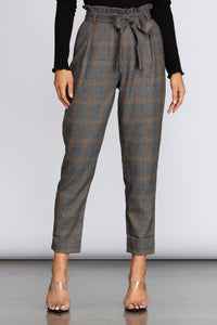 Get a poised look in plaid with these classically chic pants. They feature a paper bag waist, a tie front belt, a hidden front zipper and hook and bar closure, hidden side pockets, and a tapered leg. The bottoms are composed of a woven fabric with minimal stretch.Style Number/Barcode: 06402-0124