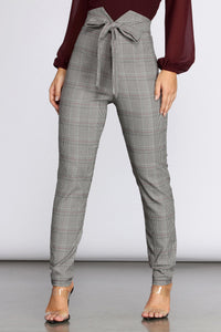 The glen check pattern on these woven pants is so chic! The bottoms feature a high rise waist with a V front cutout, a tie front detail, a back zipper closure, and a skinny, tapered leg fit. The woven fabric offers minimal stretch.Style Number/Barcode: 06402-0133
