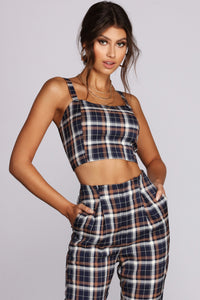 Play up your look with stylish plaid in this chic crop top! It features a sleeveless bodice, tank-like adjustable shoulder straps, a square neckline, a partial stretchy smocked back, and a cropped hem. The top is composed of a woven fabric and showcases a trendy all over plaid print with hues of navy blue, brown, and ivory. Complete your look with the matching pants!Model is 5'9" with 32" bust, 24" waist and 34.5" hips. She is wearing a size small.