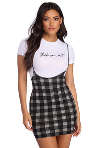 Keep it poised in plaid! This black suspender skirt features a high rise fit, spaghetti straps and a body hugging silhouette. The all over plaid print features gray and black hues to easily mix and match with your favorite tops! Skirt is composed of a woven fabric that offers a form hugging fit with minimal stretch.Model is 5'7" with a 34" bust, 24" waist and 36" hips. She is wearing a size small.