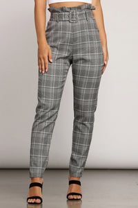 Keep it chic and poised in plaid! These must have pants feature a paper bag waist, an adjustable belt with metal grommets, a front zipper closure and a straight tapered leg. The all over plaid pattern makes these the perfect pants to pair with your favorite solid tops! Pants are composed of woven fabric that offers a relaxed fit with a minimal stretch.Style Number/Barcode: 06402-0012