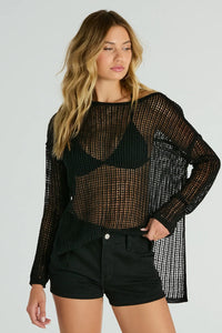 Layer on this breezy sheer crochet coverup top for an effortless pretty vibe! Made with a trendy open-knit crochet fabric, it features a wide boat neckline, long dolman-style sleeves, a long-length hem with high side slits for added movement, and an overall relaxed flowy fit. Pair with a basic bralette with denim shorts for the perf summer look.