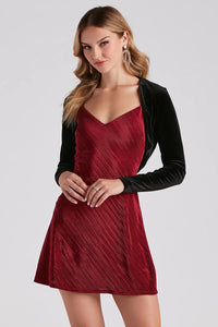 Layer on this velvety luxe bolero over your semi-formal or party dress! It features long fitted sleeves, an open-front design, and a cropped hem on soft velvet fabric with minimal stretch. Complete the look with a sparkly bracelet.