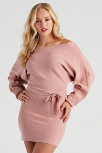 Your new classic sweater dress to embrace the cold in style! It features comfy dolman long sleeves, an off-the-shoulder neckline, and a belted waist that accentuates your curves along the short hem. Complete the look in knee-high boots for a stylish coffee run.