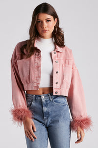 Layer on luxe with this denim crop jacket featuring long sleeves with a marabou feather trim, a collared neckline, button-down closures, and front pockets. Style with clear heels to complete your sassy look!
