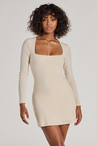 Part casual, part luxe, this long-sleeved mini dress is perfect for your next date night! The ribbed knit dress features a square neckline, long sleeves, and a mini-length hem. Complete look with knee-high boots!