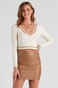 Keep it preppy with this varsity-inspired sweater! The cable knit sweater features V-neckline, long sleeves, contrasting striped trim, and a cropped hem. Complete look with a pleated mini skirt.