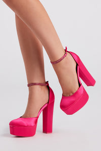 It's the season to party and you'll want to look fab for it all! Slip on these sassy satin pumps featuring a sleek closed square toe, a chunky platform sole, block heel, and a closed ankle with a rhinestone embellished strap and buckle closure. Complete the look with a shimmery clutch.