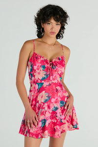 Tropical Blooms Floral Ruffle Chiffon Skater Dress Tropical Blooms Floral Ruffle Chiffon Skater DressLet this tropical floral skater dress bloom into your summer lineup! With a sweetheart neckline featuring delicate ruffle trim, adjustable spaghetti straps and padded bra cups, this skater silhouette will flatter your figure. The mini-length hem adds a flirty touch to this tropical floral printed chiffon dress. Complete the look with a crossbody purse and sandals! Fit & Features - Tropical floral print