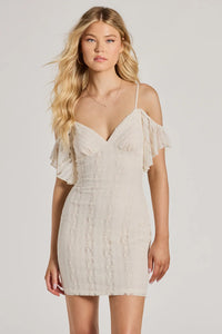 Lovely Look Cold Shoulder Bodycon Lace Mini Dress Lovely Look Cold Shoulder Bodycon Lace Mini DressNothing can compare to your lovely look in this lace mini dress as a stunning bride-to-be or birthday girlie! Featuring a trendy cold shoulder V-neckline, feminine flutter short sleeve cuffs, and delicate spaghetti straps, this dress hugs your curves for a bodycon fit that will turn heads. Complete the look with earrings and clutch. Fit & Features - Lace fabric lined with stretchy knit