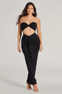 Perfect Always Strapless Cutout Ruffle Maxi Dress Perfect Always Strapless Cutout Ruffle Maxi DressHave all eyes on you in this strapless maxi dress boasting a sweetheart twist neckline and a cutout bodice. The smooth knit fabric hugs your curves along the form-hugging silhouette and creates a front center ruffle design. Fit & Features - Smooth knit lined fabric, moderate stretch