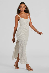 Weekend Vibes High Slit Striped Knit Maxi Dress Weekend Vibes High Slit Striped Knit Maxi DressThis casual-chic striped knit maxi dress is perfect for your laid-back weekend vibes! Designed with stretchy ribbed knit with a thin striped pattern, it features a sleeveless scoop neckline with spaghetti straps, high-cut side slits on each side for added movement, and a form-hugging slim fit on the maxi-length silhouette. Style this long dress with strappy sandals. Fit & Features - Striped ribbed knit fabric, short knit lining, moderate stretch