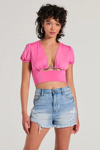 Simply Adorable Puff Sleeve Cutout Crop Top Simply Adorable Puff Sleeve Cutout Crop TopSimply adorable, this puff sleeve cutout crop top will effortlessly elevate your casual 'fits. The smooth knit fabric offers a lightweight feel and plenty of stretch. The top features a ruched V-neckline, short puff sleeves with elasticized hems, and a bold front cutout below the bust. The open lower back is accented with an adorable tie-back design. Style this fitted top with high-rise jeans and strappy mules. Fit & Features - Stretchy knit fabric, double-lined front