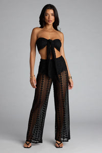 Catching Looks Crochet Palazzo Pants Catching Looks Crochet Palazzo PantsServing body and beach energy all in one slay. These crochet palazzo pants feature a high-rise waist and sheer wide-leg silhouette, perf for sipping cocktails, catching sunsets, or just catching looks. Shop Matching Top: Catching Looks Crochet Bandeau Tube Top Fit & Features - Sheer crochet fabric with panty lining