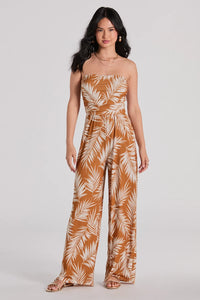 Prep For Paradise Strapless Tropical Jumpsuit Prep For Paradise Strapless Tropical JumpsuitPrep yourself for paradise starting with this tropical jumpsuit to pack in your luggage! Made from a smooth knit fabric showcasing a palm tropical print, this jumpsuit features a strapless neckline with side-ruched seams that accentuate, a flattering wide-leg silhouette. Complete the look with sunglasses and sandals! Fit & Features - Smooth knit fabric, tropical palm print, moderate stretch