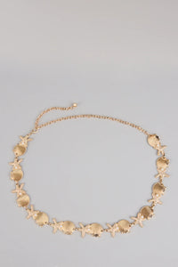 Sea You Later Chain Belt Sea You Later Chain BeltGiving mermaid off-duty energy. This chain belt brings all the coastal cuteness with starfish and shell accents—wear it poolside, seaside, or whenever you’re channeling beach babe vibes. Fit & Features - Chain-link design