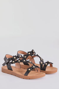 Floral Cutie Strappy Faux Leather Sandals Floral Cutie Strappy Faux Leather SandalsGive off cutie vibes in these floral strappy faux leather sandals! They feature a round toe, an asymmetric strappy design with adorable flower accents with faux pearl center detailing, an adjustable ankle strap and heel strap, and a flat sole for comfortable wear. Style with a flowy summer dress for a perf summer look. Fit & Features - Faux leather upper
