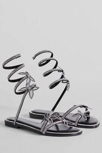 Perfectly Glam Rhinestone Butterfly Spiral Strap Sandals Perfectly Glam Rhinestone Butterfly Spiral Strap SandalsCreate a perfectly glam vibe with these rhinestone butterfly strappy sandals! Designed with sleek faux leather, they feature an almond-shaped toe, a dual toe strap and trendy spiral strap design, mini rhinestone embellishments for that glitzy shine, and organza butterfly accents with rhinestone detailing. They include a flat sole with a padded insole for comfortable wear. Style with a summer party dress! Fit & Features - Faux leather upper