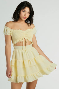 Girlycore Off-The-Shoulder Ruffled Skater Dress Girlycore Off-The-Shoulder Ruffled Skater DressEmbrace a girly-core coquette aesthetic in this skater dress perfect for sunny days! The sweetheart neckline and cutout waist add a flirty touch, while the stretchy smocked bodice hugs your curves, and the ruffled tier short-length hem adds a feminine flair. Complete the look in wedge sandals. Fit & Features - Airy woven fabric with lining