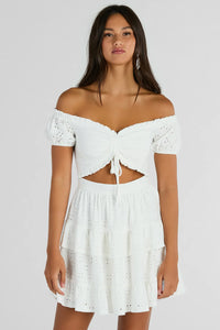 Catch A Cutie Short Sleeve Cutout Eyelet Skater Dress Catch A Cutie Short Sleeve Cutout Eyelet Skater DressCatch yourself a cutie wearing this eyelet skater dress to day parties this season! With playful puff sleeves and a flirty cutout. The sweetheart neckline and bust drawstring add a touch of romance, while the skater silhouette and tiered ruffled hem keep it fun and flirty. Complete the look in wedge sandals. Fit & Features - Eyelet fabric lined with stretchy knit