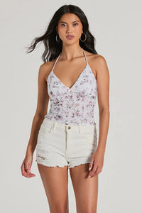 Pick Me Halter Floral Eyelet Crop Top Pick Me Halter Floral Eyelet Crop TopPick this floral crop top for the sweetest look! This halter crop top features a flattering V-neckline with a spaghetti strap tie for a perfect fit, while a sweet bow detail adds a touch of charm. The fitted crop hem and floral printed eyelet fabric give off a playful, summertime vibe. Complete the look in high-rise jeans for any casual plans! Fit & Features - Floral printed eyelet fabric, minimal stretch