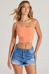 Confident Flirty Strappy One-Shoulder Crop Top Confident Flirty Strappy One-Shoulder Crop TopMake your crush stop and stare at you in this sleeveless crop top! It boasts a flirty strappy one-shoulder neckline, and a fitted crop hem, and is made from a stretchy rib knit fabric. Complete the look in a denim mini skirt for any casual plans! Fit & Features - Stretchy rib knit fabric
