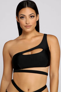 Bring a fierce and flirty vibe to your poolside look with this on-trend swim top! It features a one-shoulder neckline, a center cutout above the bust, and a cutout at the hem that goes from the front to the back. Pair this swim top with the matching swim bottoms and some chic sunglasses.