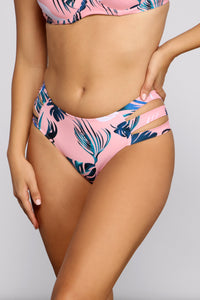 Channel a sunkissed look with bikini bottoms that will have you beach-ready! The bottoms feature a high-rise waist, a tropical print, and a cheeky bottom. Complete look with the matching bikini top and t-strap sandals.