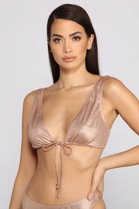 Glisten and glow as you lounge poolside in this gorgeous swim top! It features tank-like shoulder straps, a deep V neckline, a tie front detail, and a shimmery fabric. Complete your look with the matching swim bottoms and a chic flowy kimono.