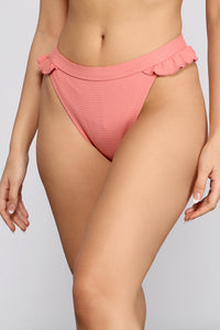Soak up the sun and bring the charm in these cute bikini bottoms! They feature a high rise waist with a ruffled trim, a waffle-print pattern, and a cheeky fit. Complete look with the matching bikini top.