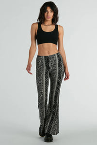 A boho-inspired print adds carefree charm to these flare pants perfect for festivals, concerts, or daytime adventures! Made with soft brushed knit fabric, these boho pants will keep you comfortable and stylish all day long. The high-rise V-waist and adjustable scrunch tie create a flattering, hip-hugging fit, while the flared hem adds a touch of playful movement. Complete the look in a cute crop tee and platform shoes.