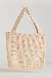 A crochet tote bag that features top handles, satin bow decorations, and a spacious interior perfect for carrying your essentials in.
