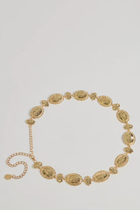 Accessorize your ride with this statement western chain belt featuring unique colored stones, oval-shaped charms, and an adjustable lobster clasp closure to secure the style. Complete the look in a fitted mini dress.