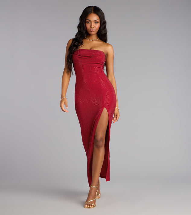 When the dress code says glamorous, the Desirae formal dress delivers. Designed in a rhinestone-studded fabric that catches every flicker of light, this strapless long dress features a sleek, form-hugging silhouette and a daring front slit made for dancing the night away.