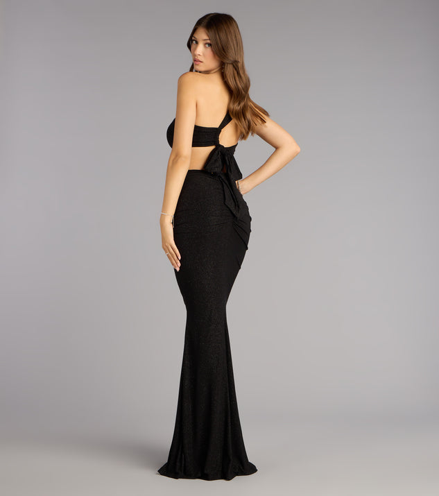 You'll radiant a sparkling glow in the Giselle glitter formal dress that perfectly catches the light with your every move! Strike the crowd with your demure in this one-shoulder dress designed with an elegant tie-back design and mermaid silhouette.